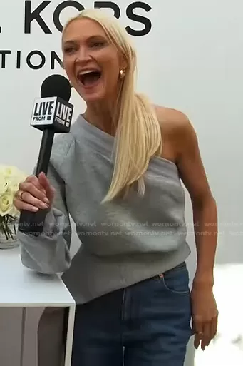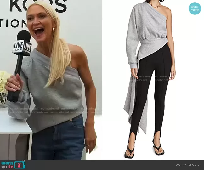 on E! News on E! was spotted wearing this Zanna Roberts Rassi’s grey one-shoulder draped top on E! News Daily Pop on Sep 13 2021's episode. 's Top is the Jersey One Shoulder Top by Brandon Maxwell.