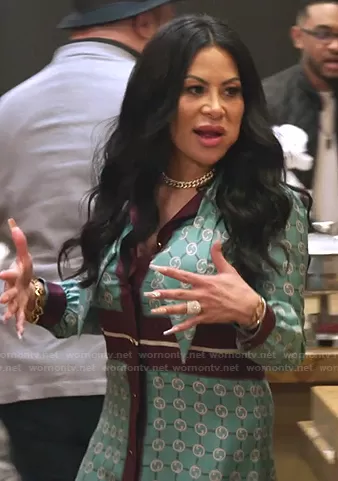 Jen Shah on The Real Housewives of Salt Lake City on Bravo was spotted wearing this green and burgundy print shirtdress on The Real Housewives of Salt Lake City on episode 'Best of Frenemies' (2x01) in Sep 2021. Jen's Dress is the Pussy-Bow Shirt Dress by Gucci.