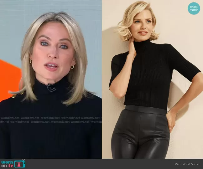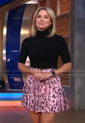 Amy Robach on Good Morning America on ABC was spotted wearing this black button detail sweater and pink leopard skirt on Good Morning America on Sep 14 2021's episode. Amy's Top is the Dalia Sweater Top by Guess . Amy's Skirt is the Heidi Leopard Miniskirt by Milly.