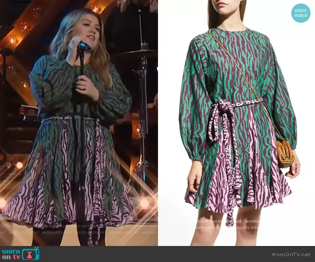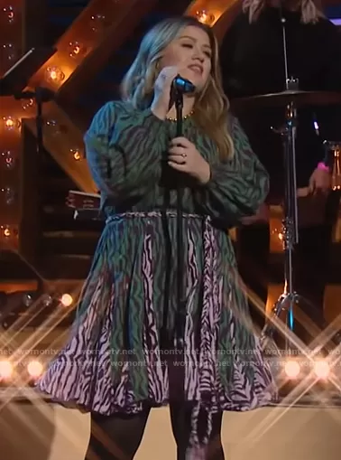 Kelly Clarkson on The Kelly Clarkson Show on NBC was spotted wearing this green zebra stripe dress on The Kelly Clarkson Show on Sep 14 2021's episode. Kelly's Dress is the Ella Dress by Rhode.