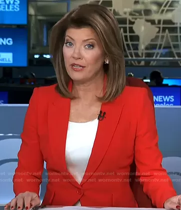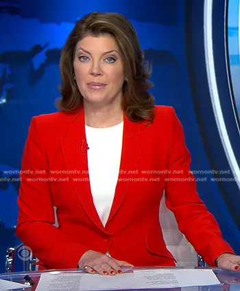Norah O'Donnell on CBS Evening News on CBS was spotted wearing this red blazer on CBS Evening News on Feb 06 2024's episode. Norah's Jacket is the Single-Breasted Crepe Blazer by Alexander McQueen.