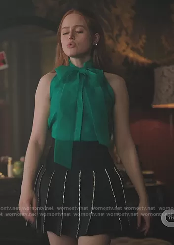 Cheryl Blossom (played by Madelaine Petsch) on Riverdale on The CW was spotted wearing this black studded skirt and green top on Riverdale on episode 'Band of Brothers' (5x16) in Sep 2021. Cheryl's Top is the Julious Blouse by Babaton at Aritzia . Cheryl's Skirt is the Crystal Trimmed Pleated Miniskirt by Area.
