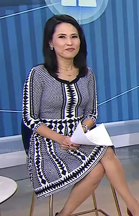 Vicky Nguyen on Today on NBC was spotted wearing this black and white geometric print dress on Today on Sep 16 2021's episode. Vicky's Dress is the Geometric Print Sweater Dress by Nina Leonard.