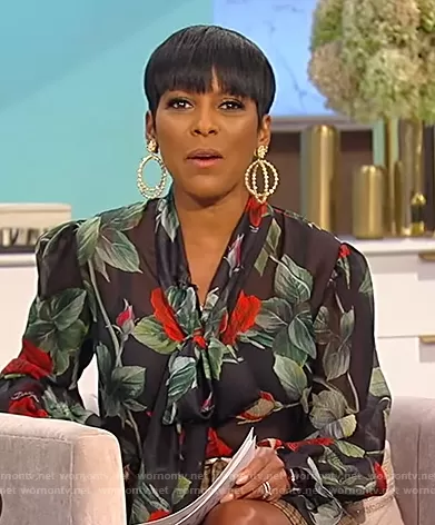Tamron Hall on Tamron Hall Show on ABC was spotted wearing this black floral print tie neck blouse on Tamron Hall Show on episode 'Band of Brothers' (5x16) in Sep 2021. Tamron's Top is the Pussy-bow floral-print silk-chiffon blouse by Dolce & Gabbana.