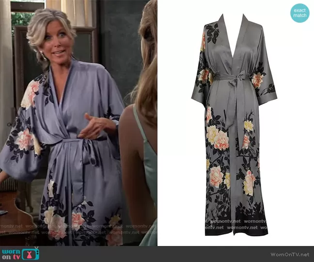 Carly Spencer (played by Laura Wright) on General Hospital on ABC was spotted wearing this floral print robe on General Hospital on Sep 17 2021's episode. Carly's Robe is the Charmeuse Kimono Robe by Old Shanghai at Amazon.