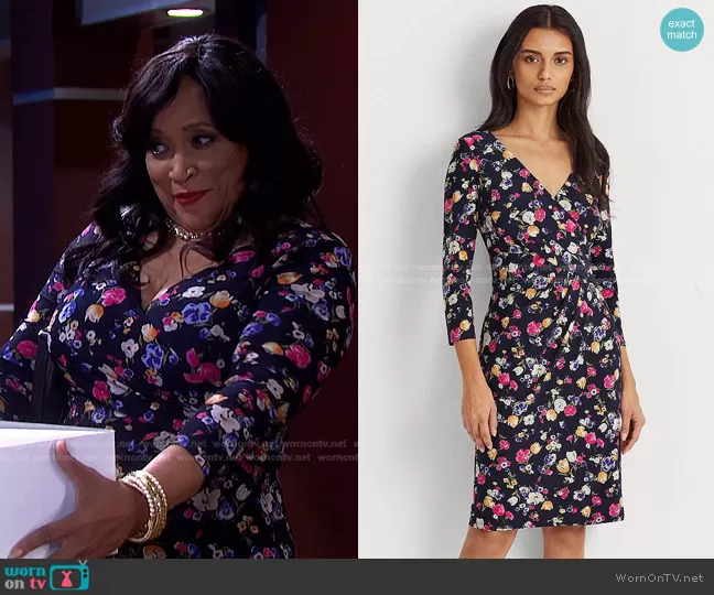 Paulina Price (played by Jackée Harry) on Days of our Lives on Peacock was spotted wearing this navy floral wrap dress on Days of our Lives on Sep 17 2021's episode. Paulina's Dress is the Floral Jersey Surplice Dress by Lauren Ralph Lauren.