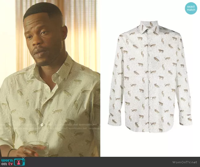 Jeff Colby (played by Sam Adegoke) on Dynasty on The CW was spotted wearing this white tiger print shirt on Dynasty on episode 'Everything Looks Wonderful, Joseph' (4x19) in Sep 2021. Jeff's Shirt is the Tiger-Print Long-Sleeve Shirt by Etro.