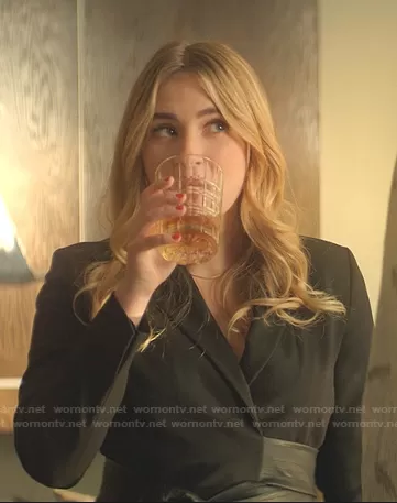 Amanda Carrington (played by Eliza Bennett) on Dynasty on The CW was spotted wearing this black wrap blazer dress on Dynasty on episode 'Everything Looks Wonderful, Joseph' (4x19) in Sep 2021. Amanda's Dress is the Rachel Blazer Mini Dress by Alexis.