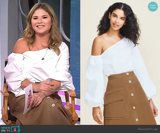 Jenna Bush Hager on Today on NBC was spotted wearing this white off-shoulder top and brown button front skirt on Today on Sep 20 2021's episode. Jenna's Top is the Cotton Poplin One Shoulder Top by Pearl by Lela Rose . Jenna's Skirt is the Stretch Cotton Button Front Skirt by Pearl by Lela Rose.