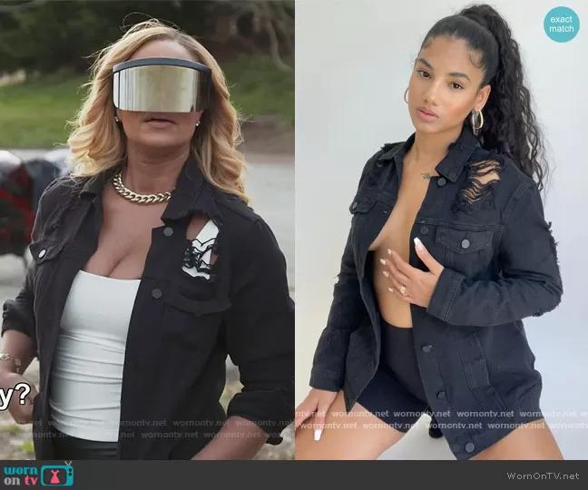 Gizelle Bryant on The Real Housewives of Potomac on Bravo was spotted wearing this black distressed jacket on The Real Housewives of Potomac on episode 'No Business Like Shade Business' (6x11) in Sep 2021. Gizelle's Jacket is the Stereo Love Denim Jacket by Fashion Nova.