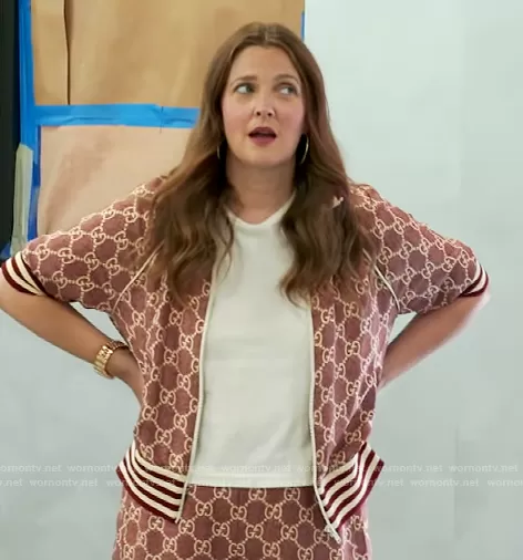 Drew Barrymore on The Drew Barrymore Show on CBS was spotted wearing this GG logo jacket and pants on The Drew Barrymore Show on Sep 20 2021's episode. Drew's Jacket is the GG Supreme print silk jacket by Gucci . Drew's Pants is the GG Supreme track pants by Gucci.