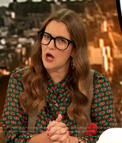 Drew Barrymore on The Drew Barrymore Show on CBS was spotted wearing this green geometric print blouse on The Drew Barrymore Show on Sep 30 2021's episode. Drew's Top is the Geometric pattern silk Blouse by Gucci.