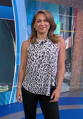 Ginger Zee on Good Morning America on ABC was spotted wearing this white leopard sleeveless top on Good Morning America on Sep 22 2021's episode. Ginger's Top is the Ella Leopard Print Silk Top by A.L.C..