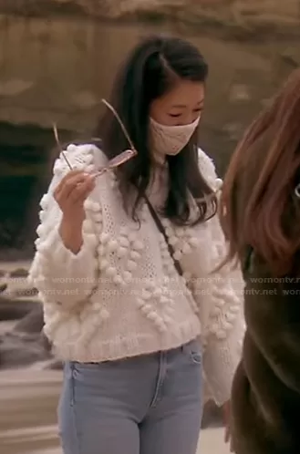Crystal Kung Minkoff on The Real Housewives of Beverly Hills on Bravo was spotted wearing this white pom pom sweater on The Real Housewives of Beverly Hills on episode 'Del Mar by the Shade' (11x18) in Sep 2021. Crystal's Sweater is the Knit Your Love Turtleneck Sweater by Chic Wish . Crystal's Bag is the Constance Elan Handbag by Hermes.