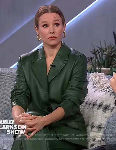 on The Kelly Clarkson Show on NBC was spotted wearing this green leather jacket and pants on The Kelly Clarkson Show on Sep 23 2021's episode. 's Blazer is the Amina leather blazer by Bouguessa . 's Pants is the Amina leather straight-leg pants by Bouguessa.