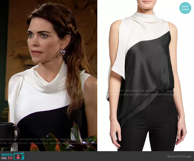 Victoria Newman (played by Amelia Heinle) on The Young and the Restless on CBS was spotted wearing this black and white draped top on The Young and the Restless on Sep 23 2021's episode. Victoria's Top is the Tavistock Top by Roland Mouret.