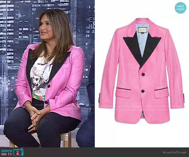on Today on NBC was spotted wearing this pink leather tuxedo blazer on Today on Sep 23 2021's episode. 's Jacket is the Leather Two-Button Jacket by Gucci.