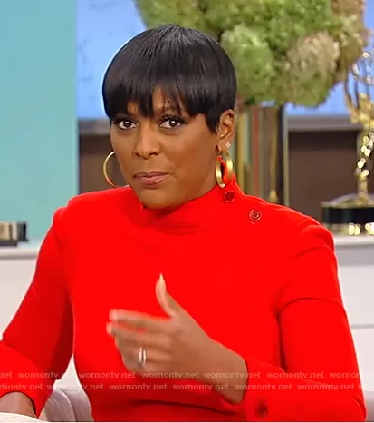 Tamron Hall on Tamron Hall Show on ABC was spotted wearing this red mock neck mini dress on Tamron Hall Show on Sep 23 2021's episode. Tamron's Dress is the Wool-blend mini dress by Saint Laurent . Tamron's Pants is the Wool-blend straight-leg pants by Saint Laurent.