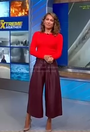 Ginger Zee on Good Morning America on ABC was spotted wearing this red top and burgundy leather cropped pants on Good Morning America on Sep 23 2021's episode. Ginger's Pants is the Faux Leather Sofia Culottes by Nicholas.