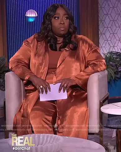 Loni Love on The Real on BETher was spotted wearing this satin duster jacket and pants on The Real on Sep 23 2021's episode. Loni's Coat is the Satin Duster with Fringe Detail by Eloquii.