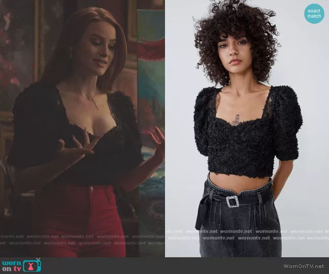 Cheryl Blossom (played by Madelaine Petsch) on Riverdale on The CW was spotted wearing this black tulle top on Riverdale on episode 'Dance of Death' (5x17) in Sep 2021. Cheryl's Top is the Tulle Sweetheart Top by Zara.
