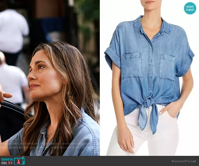 Natalie Manning (played by Torrey DeVitto) on Chicago Med on NBC was spotted wearing this denim shirt on Chicago Med on episode 'You Can't Always Trust What You See' (7x01) in Sep 2021. Natalie's Top is the Tie-Front Chambray Shirt by Bella Dahl.
