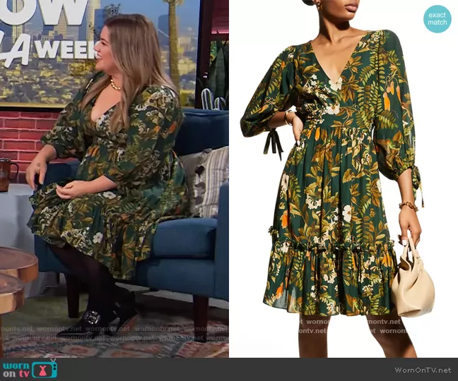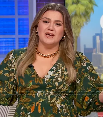 Kelly Clarkson on The Kelly Clarkson Show on NBC was spotted wearing this green floral print dress on The Kelly Clarkson Show on Sep 24 2021's episode. Kelly's Dress is the Millbrook Tie-Waist Floral Dress by Cara Cara.