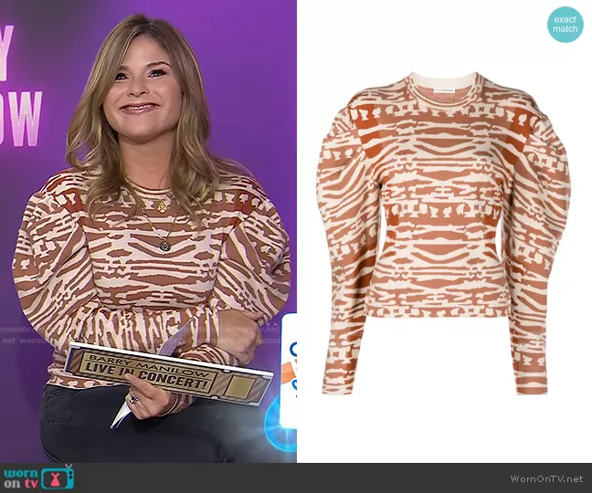 Jenna Bush Hager on Today on NBC was spotted wearing this abstract print puff sleeve top on Today on Sep 24 2021's episode. Jenna's Sweater is the Livia Jumper by Ulla Johnson.