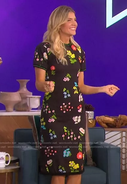 Amanda Kloots on The Talk on CBS was spotted wearing this black floral print dress on The Talk on Sep 24 2021's episode. Amanda's Dress is the Raya Tee Dress by Cynthia Rowley.