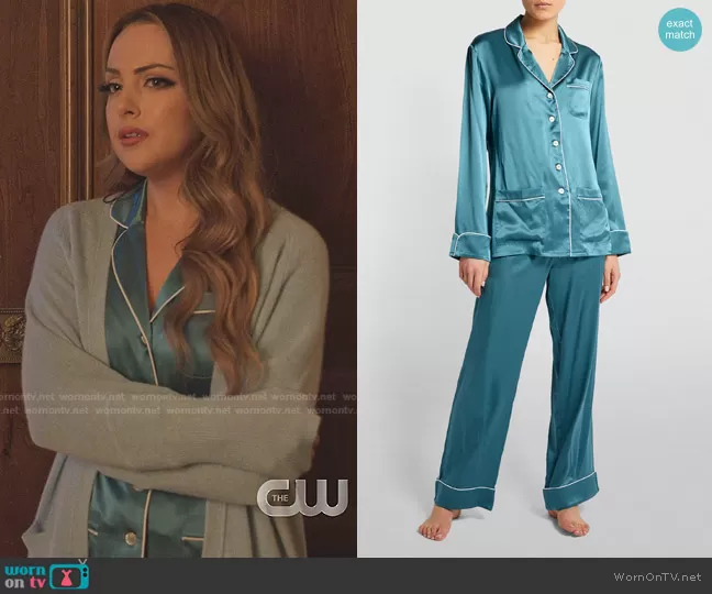Fallon Carrington (played by Elizabeth Gillies) on Dynasty on The CW was spotted wearing this blue pajamas with white piping on Dynasty on episode 'Everything Looks Wonderful, Joseph' (4x19) in Sep 2021. Fallon's Pajama Set is the Embroidered Silk Coco Pyjama Set by Olivia Von Halle.