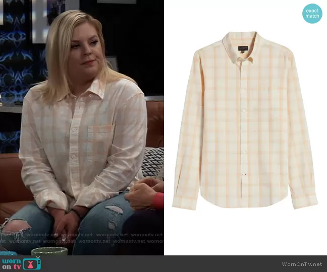 Maxie Jones (played by Kirsten Storms) on General Hospital on ABC was spotted wearing this white check blouse on General Hospital on Sep 25 2021's episode. Maxie's Top is the Plaid Stretch Button-Down Shirt by Club Monaco.