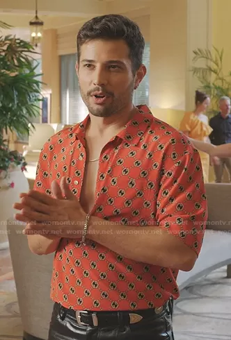 Sam Flores (played by Rafael de la Fuente) on Dynasty on The CW was spotted wearing this orange monogram print shirt on Dynasty on episode 'You Vicious, Miserable Liar' (4x20) in Sep 2021. Sam's Shirt is the Monogram-Print Short-Sleeve Shirt by Gucci.