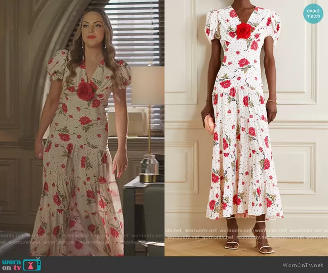 Fallon Carrington (played by Elizabeth Gillies) on Dynasty on The CW was spotted wearing this white rose print maxi dress on Dynasty on episode 'Affairs of State and Affairs of the Heart' (4x21) in Sep 2021. Fallon's Dress is the Embellished printed silk-crepe maxi dress by Rodarte.