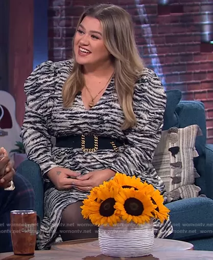 Kelly Clarkson on The Kelly Clarkson Show on NBC was spotted wearing this zebra stripe puff sleeve dress on The Kelly Clarkson Show on Sep 27 2021's episode. Kelly's Dress is the Zebra Print Puff Sleeve Midi Dress by Express.