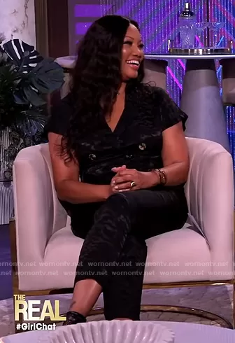 Garcelle Beauvais on The Real on BETher was spotted wearing this black double breasted jumpsuit on The Real on Sep 27 2021's episode. Garcelle's Jumpsuit is the Summer Boss Double Breasted Satin Jumpsuit by Good American.