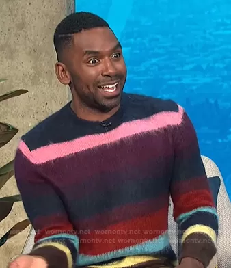 Justin Sylvester on E! News on E! was spotted wearing this multicolor striped sweater on E! News Daily Pop on Sep 27 2021's episode. Justin's Sweater is the Artist-Stripe Knitted Jumper by PS Paul Smith.