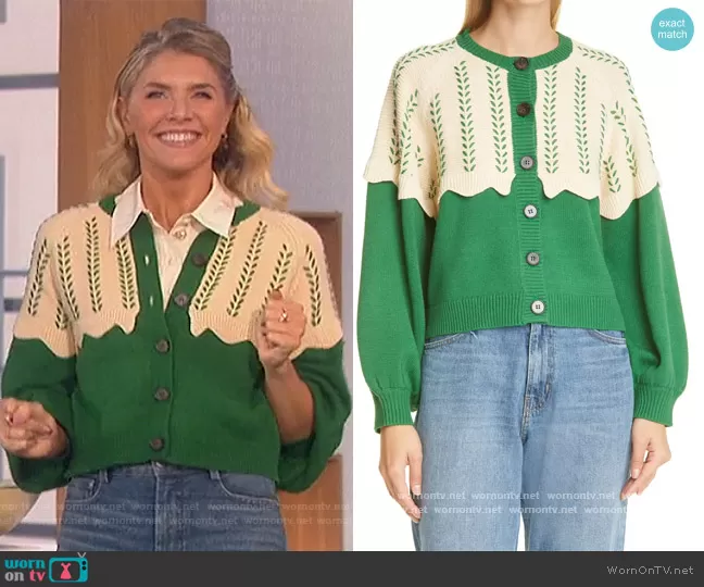 Amanda Kloots on The Talk on CBS was spotted wearing this green scalloped trim cardigan on The Talk on Sep 27 2021's episode. Amanda's Sweater is the The Scallop Sophomore Cardigan by The Great.