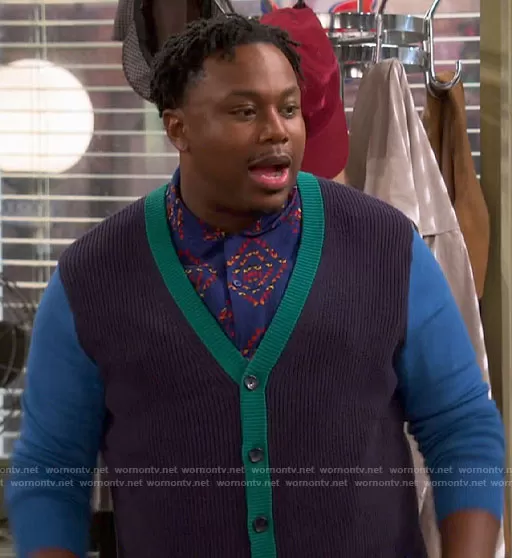 Marty (played by Marcel Spears) on The Neighborhood on CBS was spotted wearing this colorblock cardigan and printed shirt on The Neighborhood on episode 'Welcome to the Intervention' (4x02) in Sep 2021. Marty's Shirt is the Fred Regular-Fit Geo-Print Textured Linen Shirt by Sun + Stone . Marty's Sweater is the Colorblock Varsity Cardigan by BP.