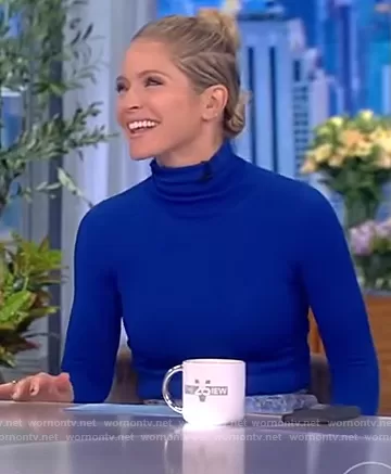 Sara Haines on The View on ABC was spotted wearing this blue turtleneck top and skirt on The View on Sep 28 2021's episode. Sara's Top is the Funnel-neck long-sleeve top by Stella McCartney . Sara's Skirt is the High-waisted lace pencil skirt by Dolce & Gabbana.