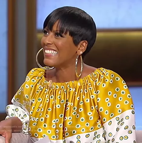Tamron Hall on Tamron Hall Show on ABC was spotted wearing this printed off shoulder dress on Tamron Hall Show on Sep 28 2021's episode. Tamron's Dress is the Tavrina Off-The-Shoulder Midi Dress by Silvia Tcherassi.