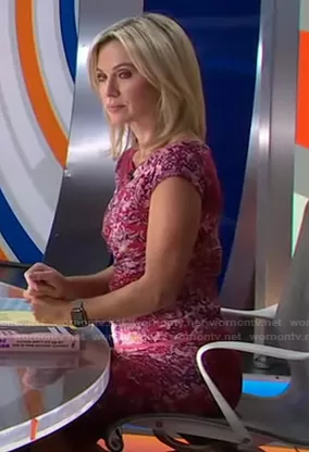 Amy Robach on Good Morning America on ABC was spotted wearing this red printed cap sleeve top and skirt on Good Morning America on Sep 28 2021's episode. Amy's Top is the Cap-Sleeve Printed T-Shirt by Fuzzi . Amy's Skirt is the Ruched Midi Skirt by Fuzzi.