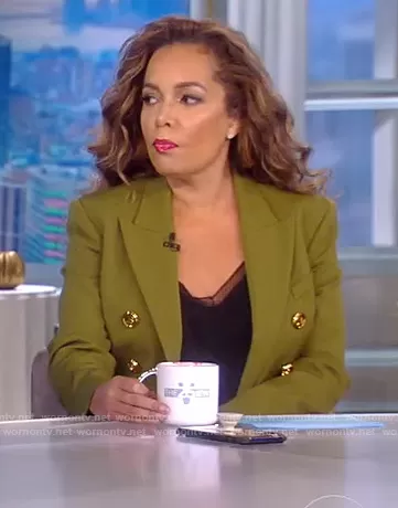 Sunny Hostin on The View on ABC was spotted wearing this green double breasted blazer on The View on Sep 29 2021's episode. Sunny's Blazer is the Button-front peak-lapel Blazer by Balmain.