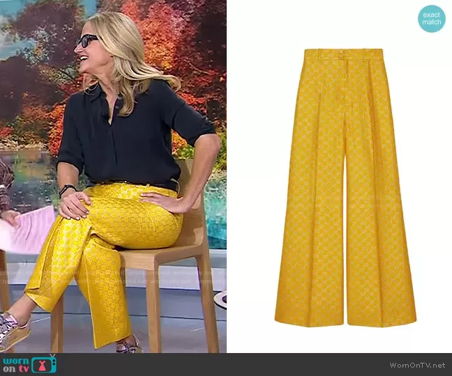 on Today on NBC was spotted wearing this yellow metallic pants on Today on Sep 29 2021's episode. 's Pants is the GG Lamé Wide Leg Trousers by Gucci.