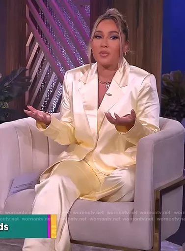 Adrienne Houghton on The Real on BETher was spotted wearing this yellow satin blazer and pants on The Real on Sep 30 2021's episode. Adrienne's Blazer is the Satin Blazer with Belt in yellow by Collusion . Adrienne's Pants is the Straight Leg Satin Pants in yellow by Collusion.