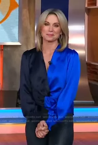 Amy Robach on Good Morning America on ABC was spotted wearing this blue colorblock twisted blouse on Good Morning America on Sep 30 2021's episode. Amy's Top is the Color Blocked Twist Front Top by Aqua.