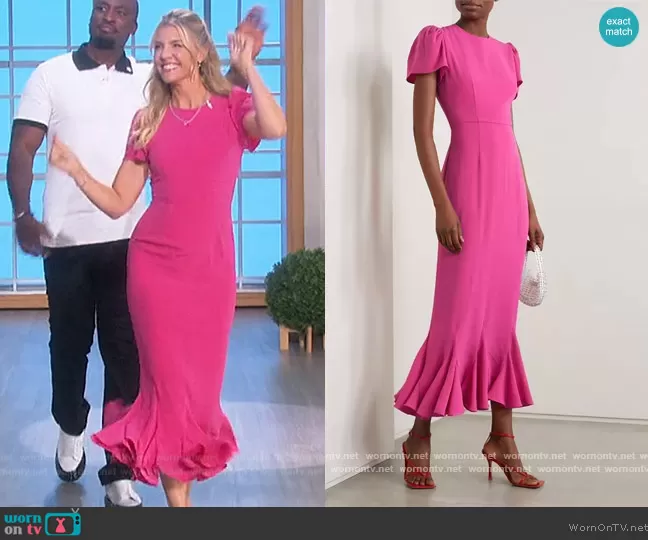 Amanda Kloots on The Talk on CBS was spotted wearing this pink ruffle hem midi dress on The Talk on Jul 22 2022's episode. Amanda's Dress is the Lulani ruffled crepe midi dress by Rhode.