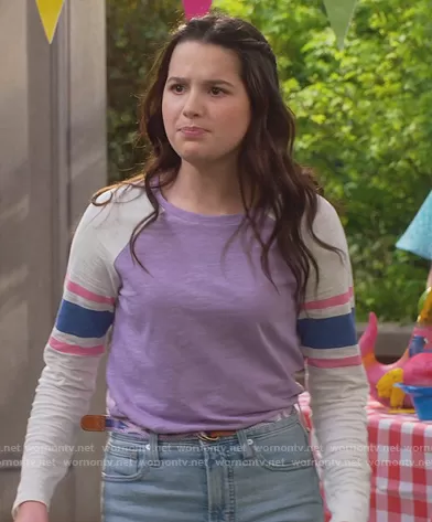 Lex (played by Jules LeBlanc) on Side Hustle on Nickeldeon was spotted wearing this purple raglan tee on episode 'Love Sensei' (1x23) in Sep 2021. Lex's Top is the Lorna Baseball Jersey Tee by Boden.