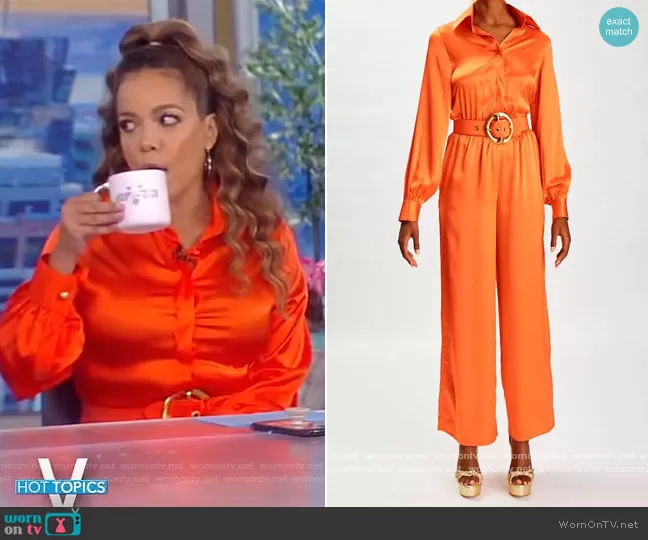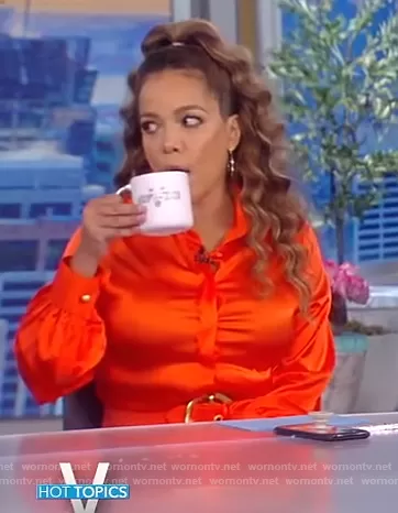 Sunny Hostin on The View on ABC was spotted wearing this orange belted dress on The View on Oct 01 2021's episode. Sunny's Dress is the Satin Belted Dress by Sergio Hudson.