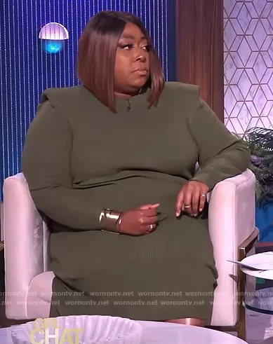 Loni Love on The Real on BETher was spotted wearing this green knit dress on The Real on Oct 01 2021's episode. Loni's Dress is the Strong Shoulder Sweater Dress by Eloquii.