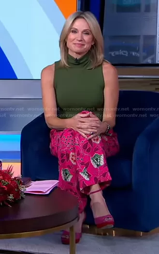 Amy Robach on Good Morning America on ABC was spotted wearing this green turtleneck top and pink floral pants on Good Morning America on Oct 01 2021's episode. Amy's Top is the Darina Mockneck Shell by Alice + Olivia . Amy's Pants is the Floral Tailored Wide Leg Pants by Scotch & Soda.